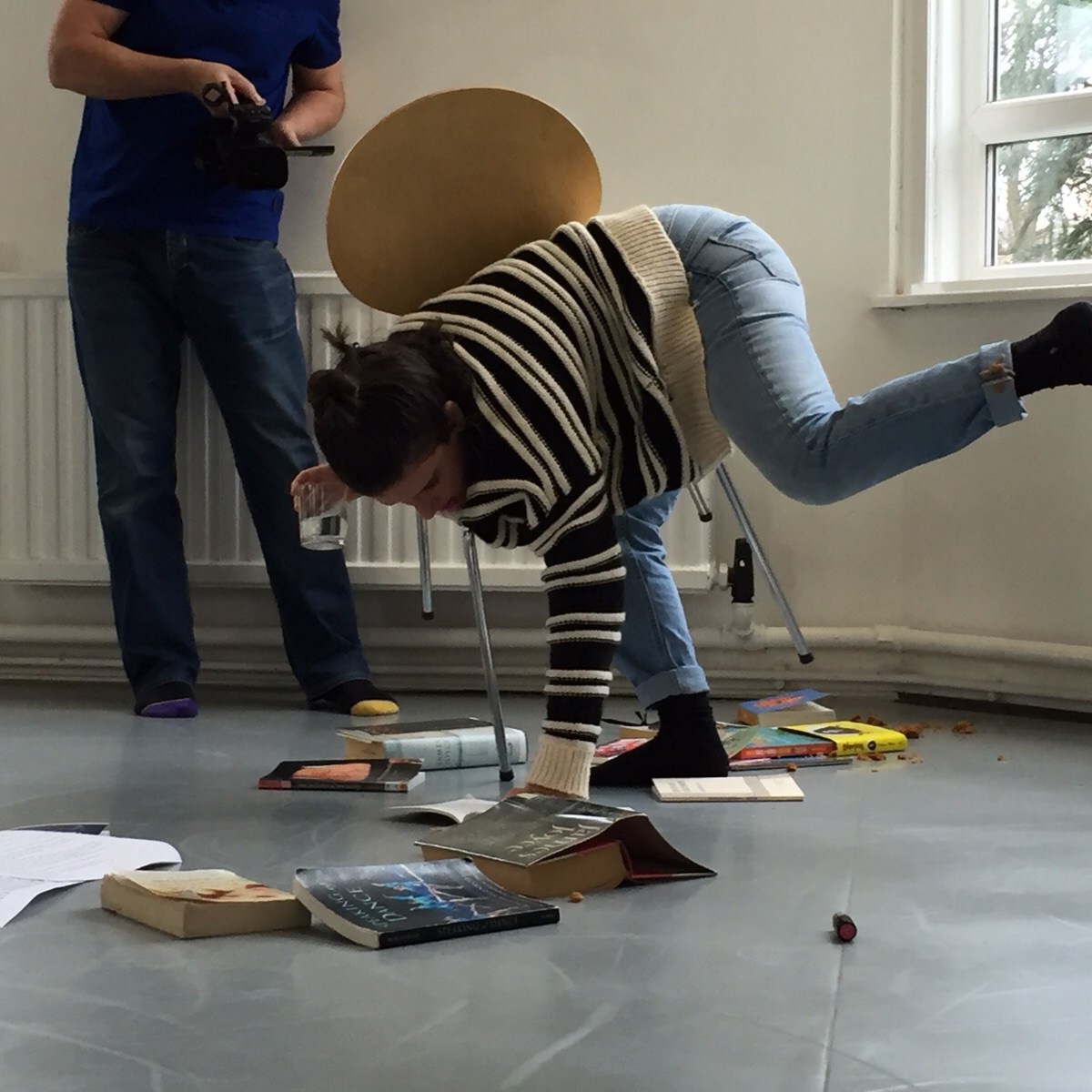 “[…] trouping in one by one, which become more and more disordered and absurd, as the body became more and more absurd. I was really aware of how you were just getting into another sentence but slammed the book down before another came in. […] I enjoyed it, I enjoyed the absurdity very much. I enjoyed sitting, formally, watching you to begin – and then realising that actually this is not a formal reading at all. I enjoyed the lipstick, I enjoyed your body shaking, as it was trying to read and maintain the positions. I really enjoyed the eating. How can I make this more … failing? How can I fail more? I really got that Beckett sense: how can I fail better?”