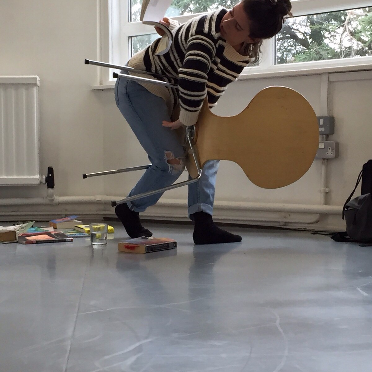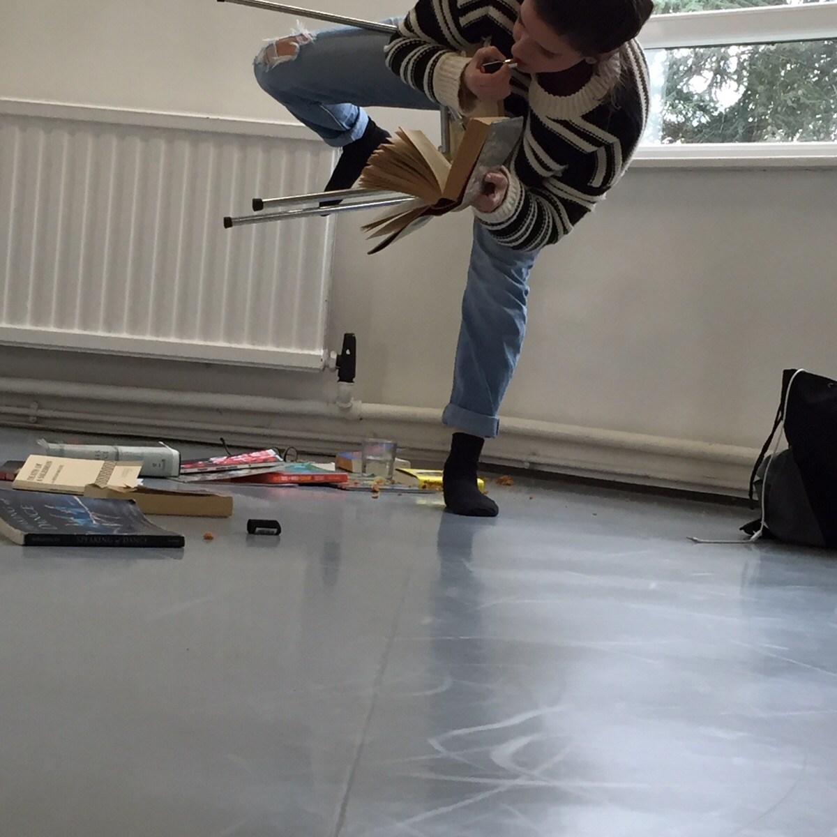 “I remember a pile of books, an accumulation of audience as well, and I remember James Joyce being thumped onto the ground. […] And your poses are absurd and awkward and problematic. And I still remember, and I loved, the dropping of the books, and the treatment of these books with utter disdain. There’s something really strong about the ‘fucking books’ attitude. And there was a sort of constant refreshing of the work – and that was about the new book, the new reading, the presence of the new member of the audience. And also about the increasingly absurd mechanisms, or ways, in which you might do this reading. I had this feeling that it almost became vaudevillian, like a circus act: how far can this go? It was always a question for me while watching this: How far might this go?”